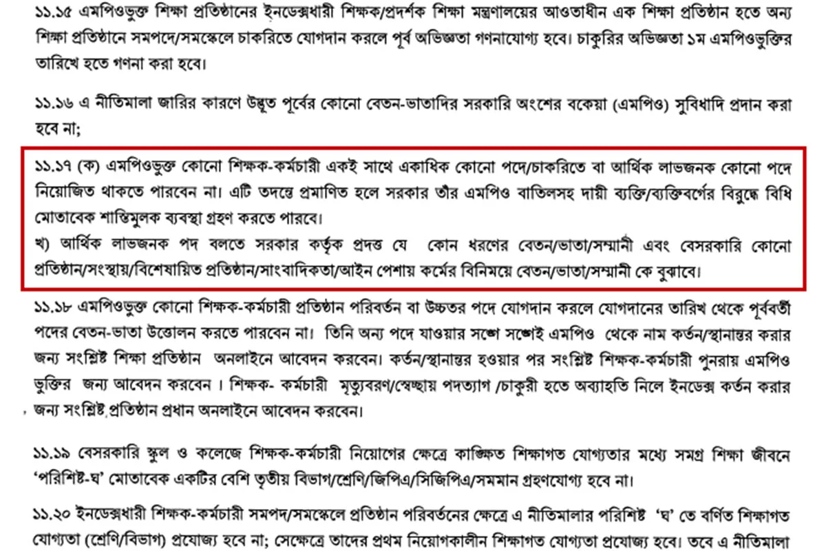 ১১.১৭ (ক) ধারায় বলা হয়েছে, এমপিওভুক্ত শিক্ষক–কর্মচারী একাধিক পদের চাকরি বা অন্য কোনো আর্থিক লাভজনক পেশায় যুক্ত থাকতে পারবেন না। তদন্তে এটি প্রমাণিত হলে সংশ্লিষ্ট ব্যক্তির এমপিও বাতিলসহ বিধি অনুযায়ী শাস্তিমূলক ব্যবস্থা নিতে পারবে সরকার।