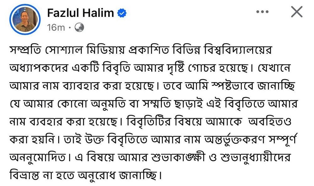 বেশ কয়েকজন শিক্ষক ইতোমধ্যে ফেসবুকে নিজেদের প্রোফাইলে পোস্ট করে এই বিবৃতির সাথে তাদের সম্পর্ক নেই বলেও জানিয়েছেন।